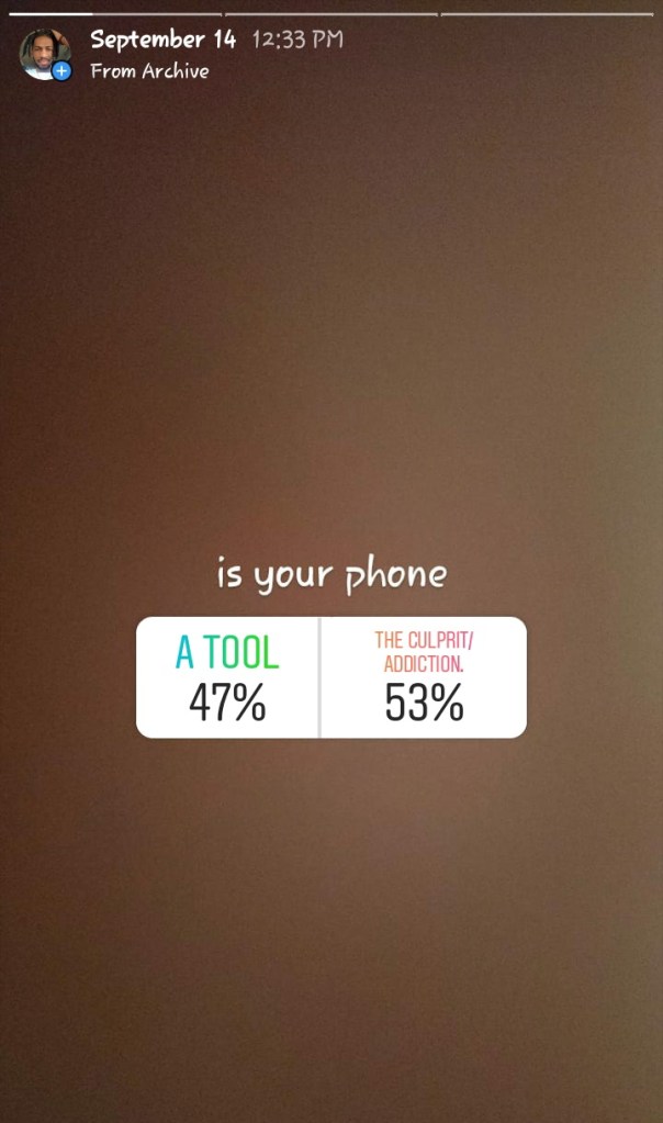 i was thoroughly surprised by the response. seeing who said culprit and addiction, i wasn’t. some of the people who said A TOOL, i was a bit. how many people our generation truly uses a phone as a tool unless it’s a designated work phone… i mean, check your screen time and let me know how many minutes our hours was used for texting and calling vs social media. let me know how much time was spent on i*stagram. checking comments and going down rabbit holes.