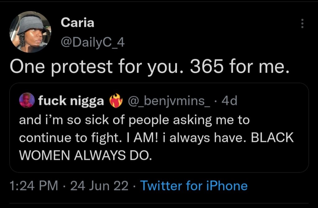 and we still live it while woke generation think buzzwords and hashtags is enough. i’m not one of them social media opportunists who post lazy colorful posts when it’s trending. this is bigger than me. this is bigger than two laws. this is bigger than a political party. Black people have been fighting for human rights since the inception of the country, meanwhile, back at the ranch, people focusing on specific rights based on sex and sexuality. Black women been at the forefront of all human rights violations. majority woke generation wake up when something is trending, or a republican becomes a president. because when kay ivey, alabama governor, signed an abortion ban in 2019, women didn’t even know. it wasn’t talked about. but let a man do it and all of a sudden, identity politics join the convo and MEN SHOULD NOT MAKE DECIS… nevermind. and then when someone speaks a truism, feelings are hurt and people become uncomfortable, and back out of human rights, and continue fighting for categorized rights. if anyone is confused, i’ve been talking about control of the country this whole time.